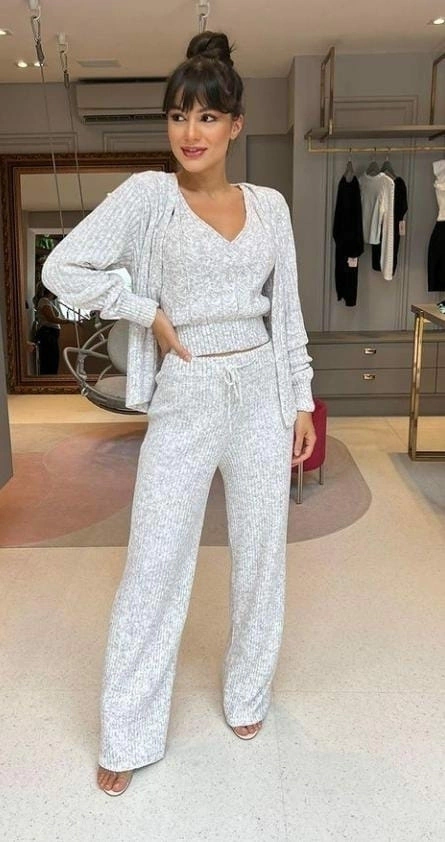 Conheça o Conjunto Tricô Musse! O trio perfeito que vai te deixar quentinha e estilosa! Este conjunto inclui calça, regata e casaco, tudo em um só pacote.