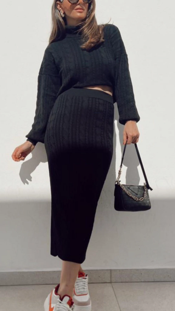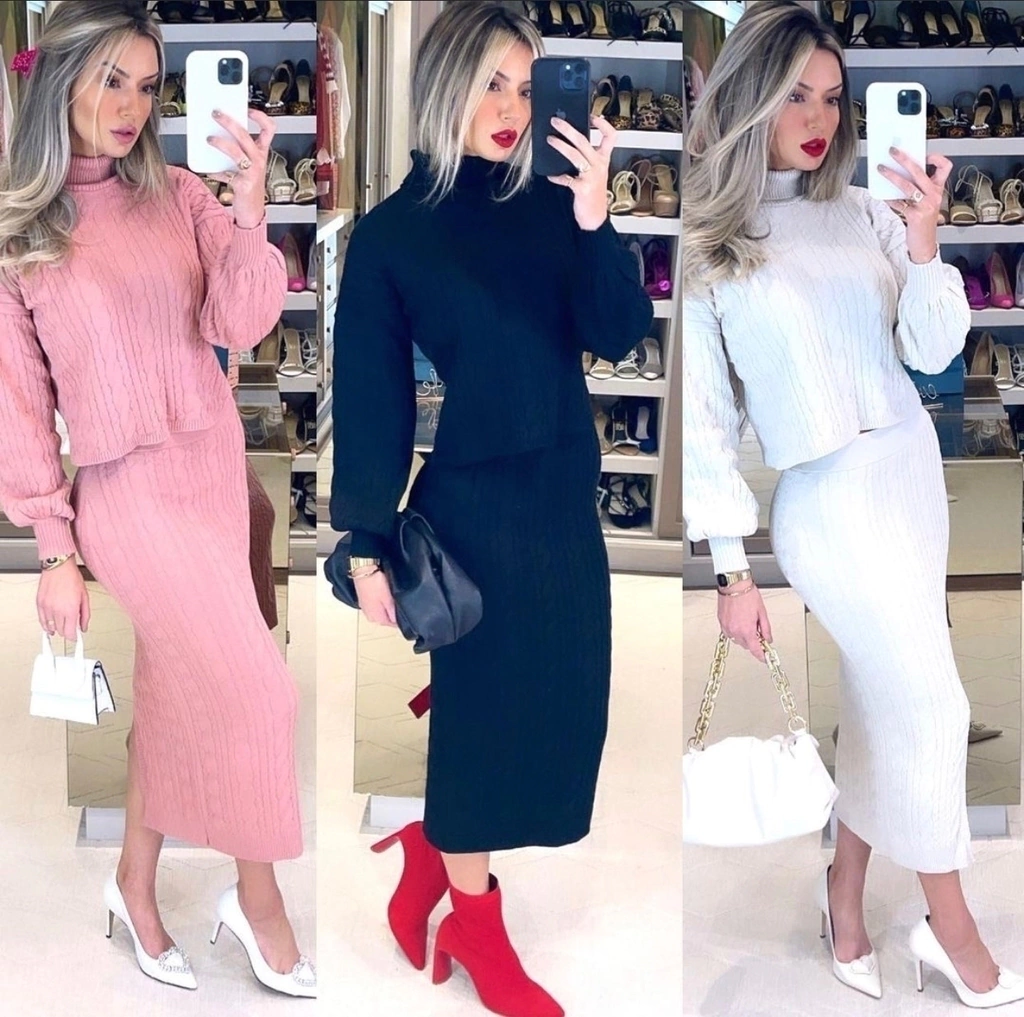 Conjunto Luiza - A sofisticação e o conforto se unem neste encantador conjunto de tricô. Com um trabalhado de tranças que valoriza a silhueta, ele possui uma gola alta rolê e uma saia midi com fenda, perfeita para qualquer ocasião.